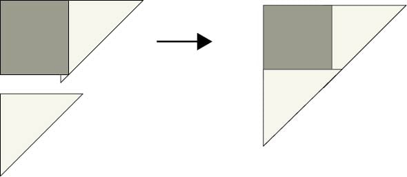 2. Sew triangle pieces to the bottom and top edges of the Fabric A square. Open and press. Trim away the dog ear corners.