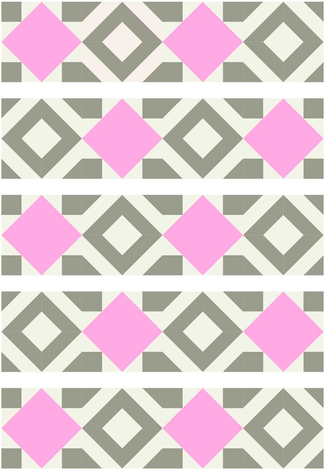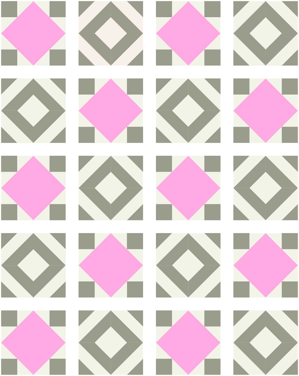 1. Arrange the 20 quilt blocks in 5 rows with alternating Art Square Blocks and Mosaic Number 1 Blocks.