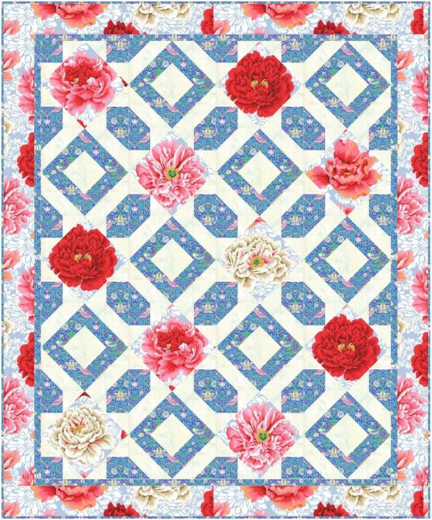 Another fun way to use this pattern is to fussy cut the fabrics for the Art Square blocks. Look how gorgeous the quilt could be with Kaffe’s peony fabric. I have some of this leftover 108” wide fabric that I want to use soon. I imported a picture of it into my EQ8 Quilt Design Software to see what it would look like. The coordinating fabric is Blue Strawberry Thief from the Kaffe Fassett x Morris & Co. collection.
