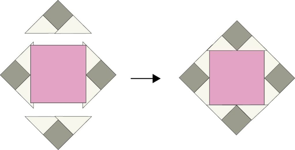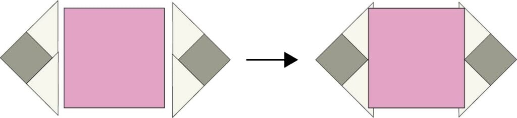 1. Sew triangle pieces to the sides of a Fabric A 7 5/8” x 7 5/8” square. Open and press. Trim away the dog ear corners at the top and bottom edges.
