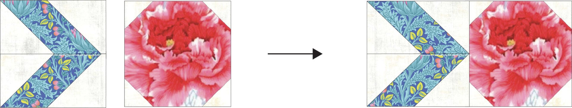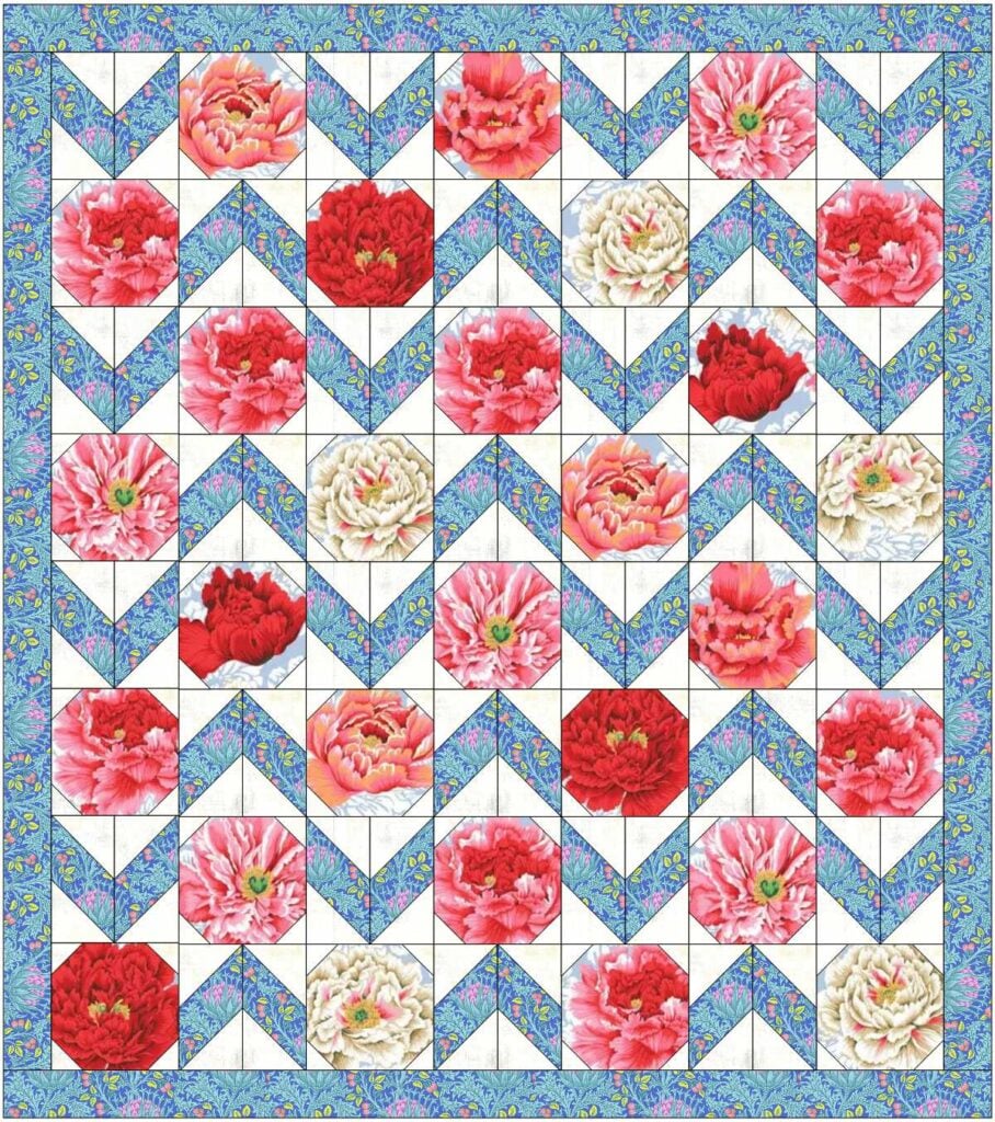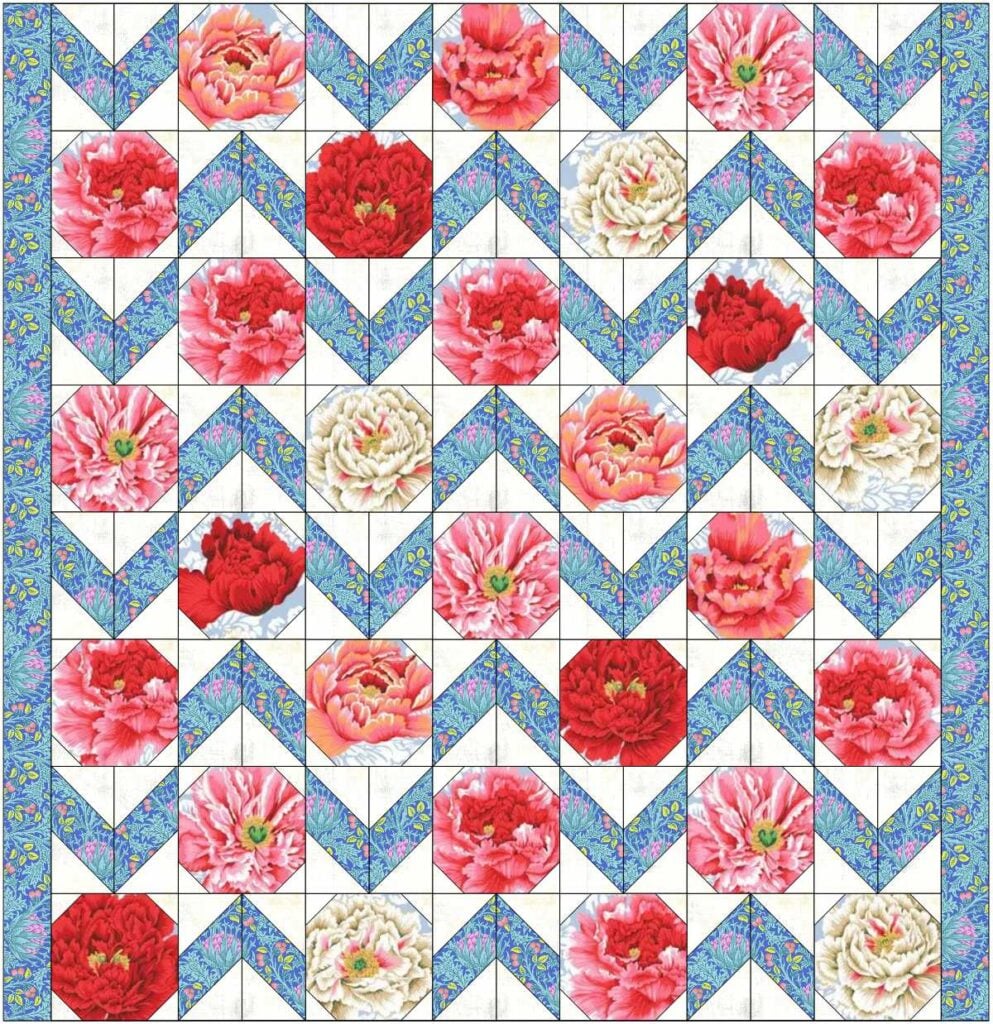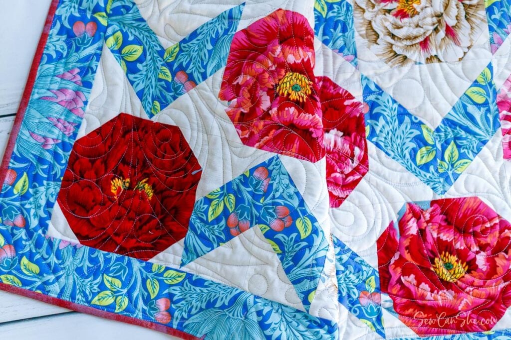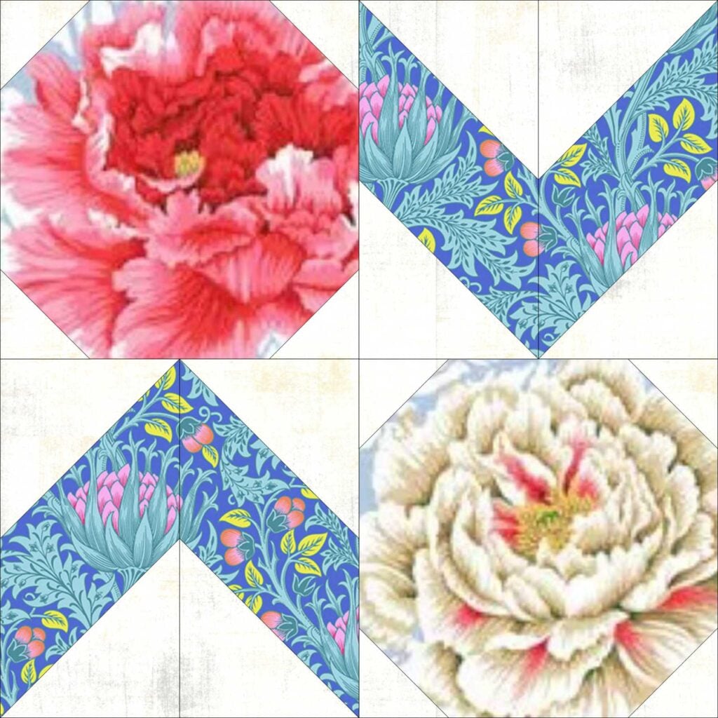 I decided to fussy-cut flowers from Kaffe Fasset Collective’s Brocade Peony fabric. I had leftover 108” quilt backing fabric in this print, but there are other colorways available too in regular 44” wide yardage. If you search Google or Amazon for ‘Peony Brocade Fabric‘, you’ll see the options. Keep in mind that fussy cutting individual flowers or motifs will probably mean you need more than 1 yard of that fabric.