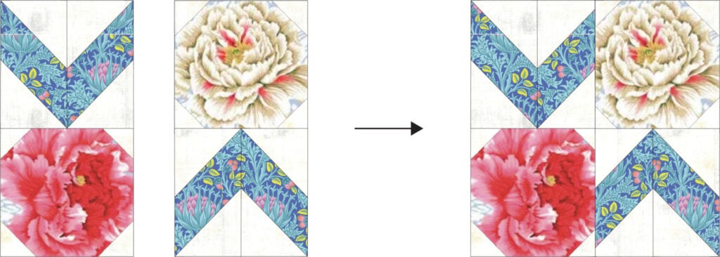 2. Sew two half-block pieces together as shown. Take note of the orientation.