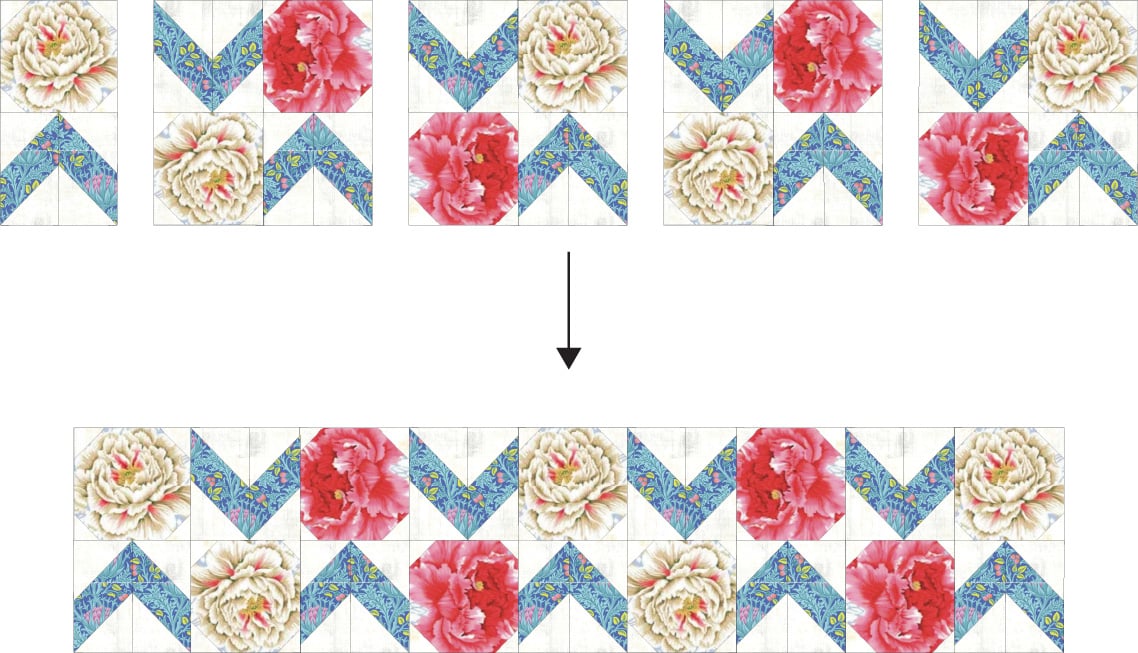 1. Arrange 1 half-block and 4 whole Spitfire blocks into a row as shown. Sew with a 1/4” seam allowance.
