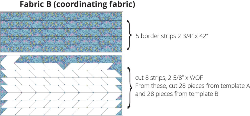- 8 strips 2 5/8” x WOF (width of fabric). Subcut these strips using the free printable templates: