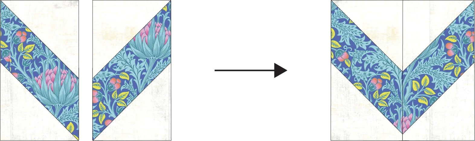 1. Sew a chevron block to a snowball block as shown. Make sure that the chevron block is pointing toward the snowball block.