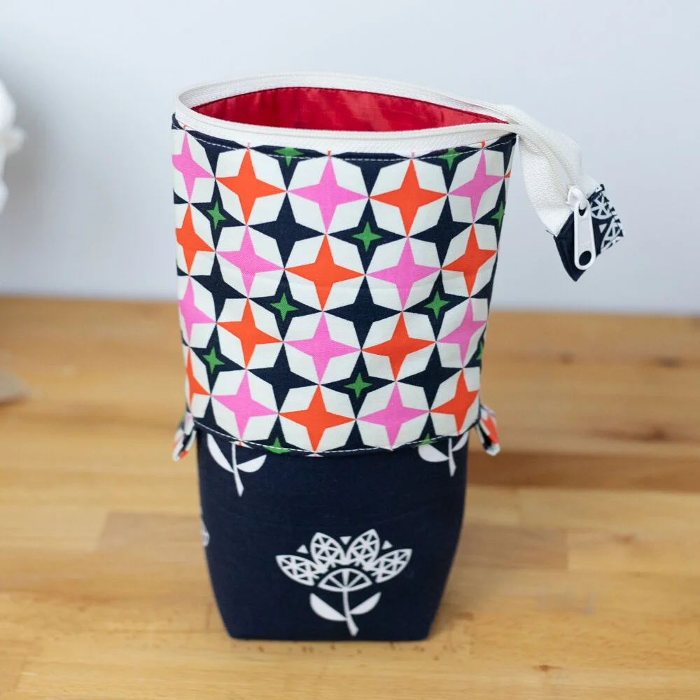 You’ll have the option of using nylon or polyester lining fabric for all of the lining or just the top portion. The rest of the pouch is fat quarter friendly!
